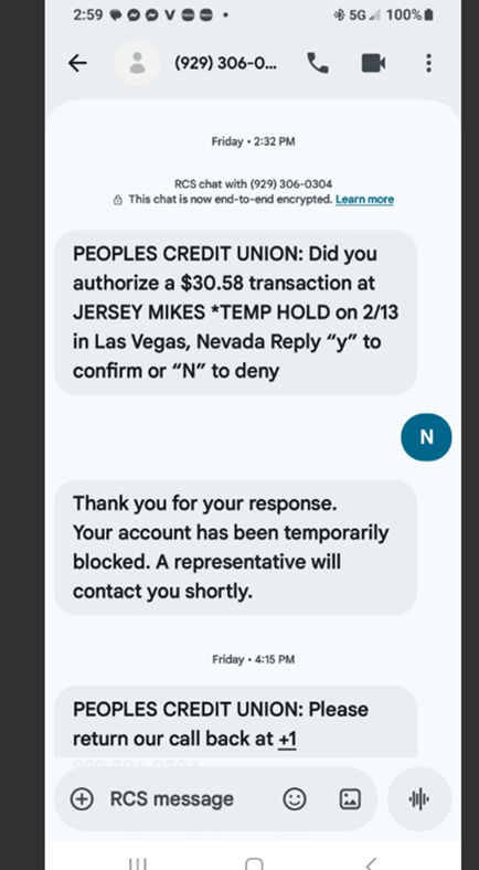 People’s Credit Union has been informed that members are receiving fraudulent calls and texts asking to “verify” transactions. Please do not give out any information, and contact our Member Service Center at 800.498.8930 if you receive a suspicious text or call.